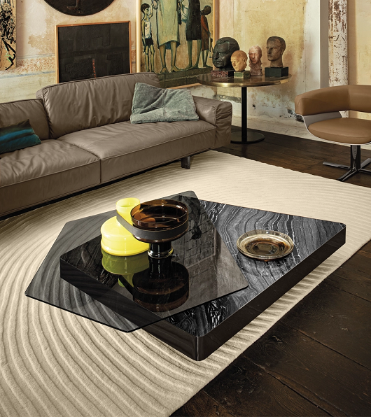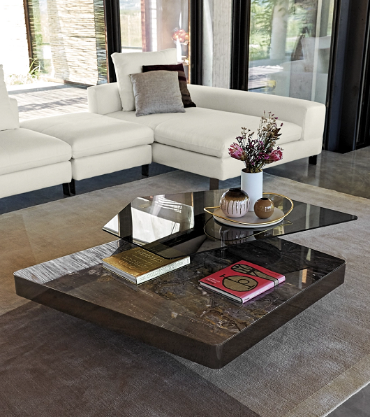 Gornji deo je od dimljenog stakla koji je povezan sa rotirajućim cilindrom I probija se kroz donju,debelu mermernu ploču. Kompleksan I soficistiran geometrijski dizajn odrađava istinski dinamičan način života.