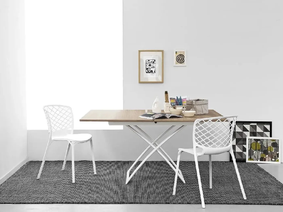 Klub stočić MAGIC-J, metalni okvir i ploča obložena melaminom. Može se razvući i podesiti po visini. MAGIC-J je svestrani sto za dnevnu sobu koji se, kada je potrebno, može transformisati u trpezarijski sto za 4-6 osoba u samo nekoliko jednostavnih koraka: jednostavno pritisnite dugme na dužoj strani da biste podesili visinu u 7 različitih položaja. Ploča obložena melaminom ima otvor u obliku knjige. Sa klub stočićem MAGIC-J, ulazite u dimenziju u kojoj se vaš kućni prostor transformiše kako bi zadovoljio potrebe savremenog života!