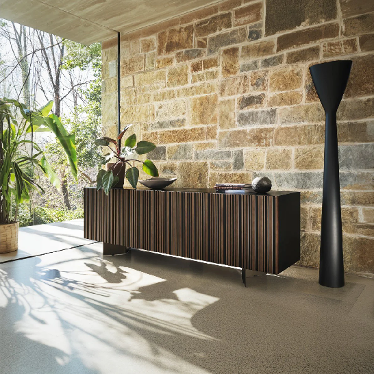 Vrata Stripes imaju uzorak nepravilnih vertikalnih traka. Završna obrada od brušene bronze stvara interakciju volumena i dubine koja ističe estetiku komode, čineći je centralnim delom u dnevnom boravku.