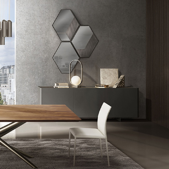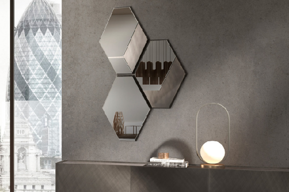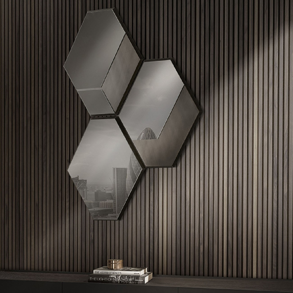 Geo je geometrijsko zidno ogledalo originalnog dizajna i savršeno je kada se kombinuje u više kompozicija: idealan dodatak za uređenje koji inače anonimni zid čini jedinstvenim. U ovom geometrijskom zidnom ogledalu prepoznajemo Mum dizajn koji ga je unapredio izborom kvalitetnih materijala: dimljeno staklo sa okvirom od brušene bronze. Geo kolekcija sadrži ogledala u savršenoj geometrijskoj kompoziciji: naizmenični šestouglovi koji smenjuju refleksije i neprozirnosti. Lakirani okvir sa završnom obradom od brušene bronze je dragocen.