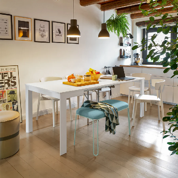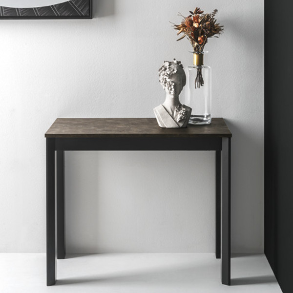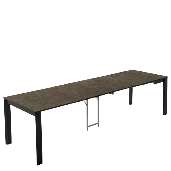 Konzolni sto EMINENCE CONSOLLE. Metalni okvir i melaminska ploča. Konzolni sto se može podesiti na različite veličine u koracima od 50 cm. Stabilnost je zagarantovana čak i kada je gornja ploča potpuno otvorena (300 cm) zahvaljujući petoj centralnoj nozi. Neiskorišćeni produžni listovi se čuvaju u posebnoj plastičnoj fascikli.