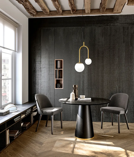 Ted Bistro sa drvenom pločom je sto modernog, elegantnog stila i pogodan za osvajanje svakog okruženja. Baza, koju je osmislio dizajner Nello Palomba, je dvobojna ili jednobojna i podržava okruglu drvenu ploču sa kosim ivicama, debljine 20 mm.