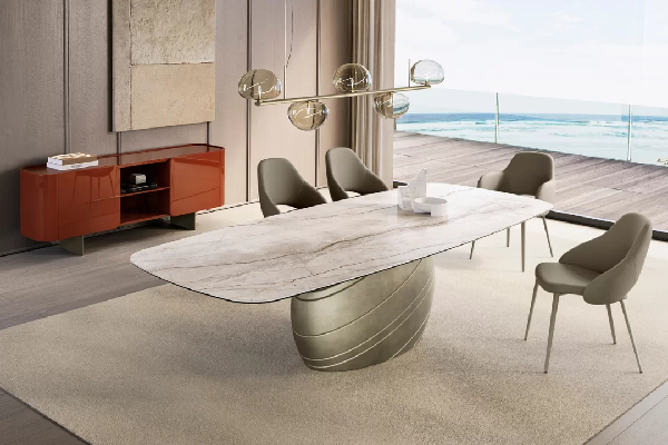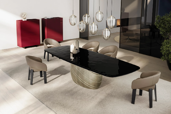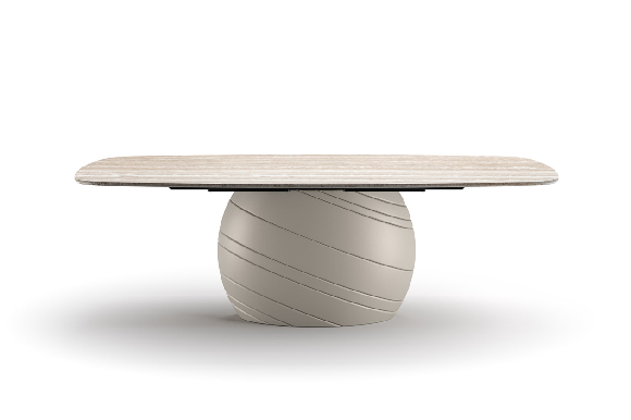 Trpezarijski sto Giove crpi inspiraciju iz nebeskih oblika i astrološke simbolike. Njegova skulpturalna baza i čiste linije odražavaju eleganciju planetarnog kretanja, sa fokusom na harmoniju i prisustvo. Sa strane, ovalni postolje deluje gotovo cilindrično, njegova površina detaljno je ispunjena uglovima, udubljenim linijama koje kao da se suptilno menjaju sa svetlošću i perspektivom. Rezultat je upečatljiv centralni deo koji deluje istovremeno prizemljeno i eterično.
