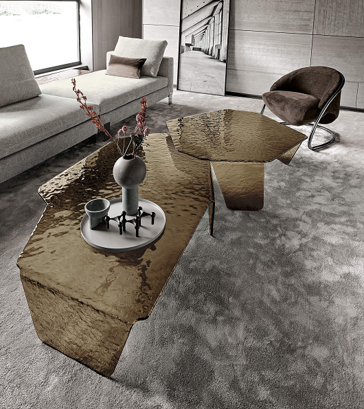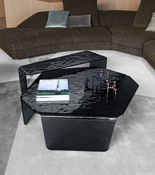Napravljen od zakrivljenog i čekićanog dimljenog stakla, sto zadivljuje vijugavim oblikom ploče koja se savija u tri strateške tačke kako bi oslonio strukturu koja ga podržava. Posebna obrada stakla znači da svetlost može da se igra i stvara iluziju talasa koje nosi vetar.