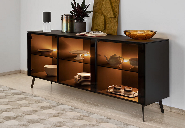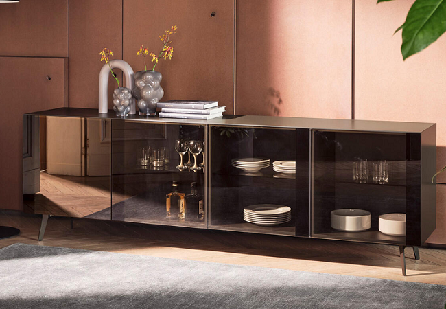Elegantna i minimalistička, staklena vrata su redizajnirana u bronzanoj i dimljenoj verziji, sa opcionim unutrašnjim osvetljenjem. Dizajnirana za savremeni dnevni boravak, Kristal podseća na antičke komode, gde su posuđe i stakleno posuđe bili ostavljeni na vidiku.