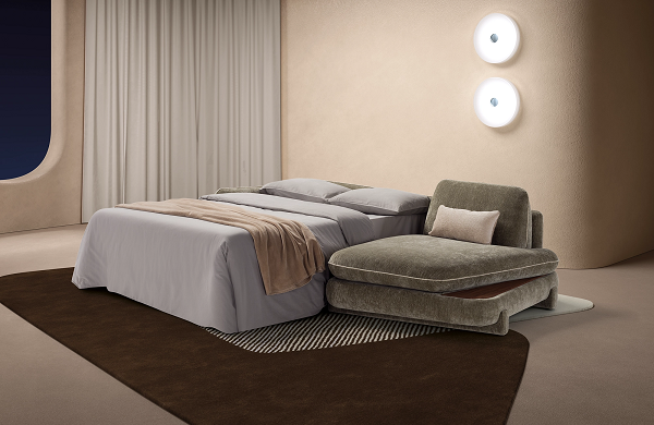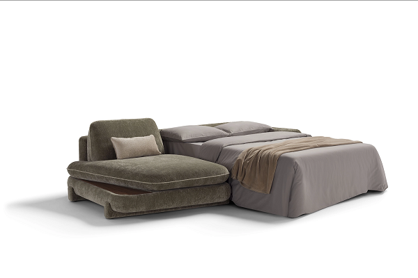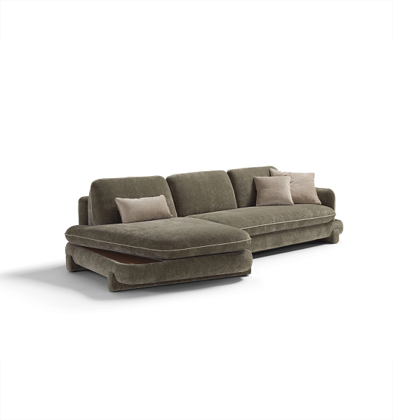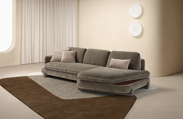 Modularni dizajn sa elementom ležaljke. Alternativna ležaljka zaobljenog oblika i drvene ploče. Isti detalj se nalazi i na spoljnoj strani sofe na razvlačenje.